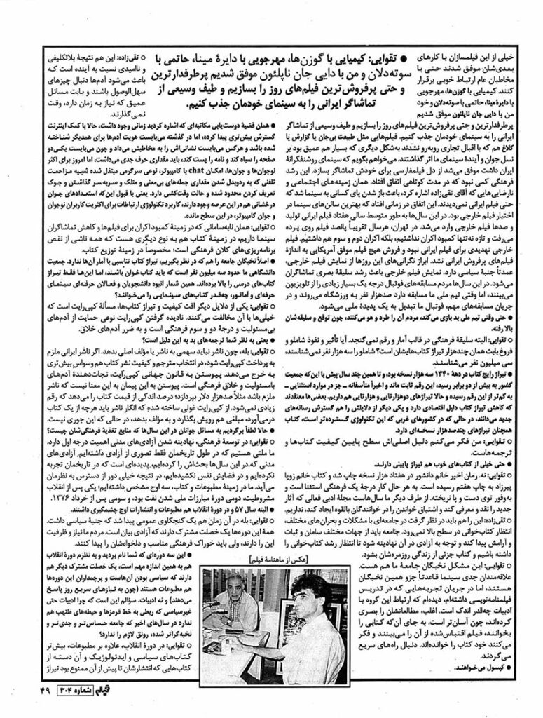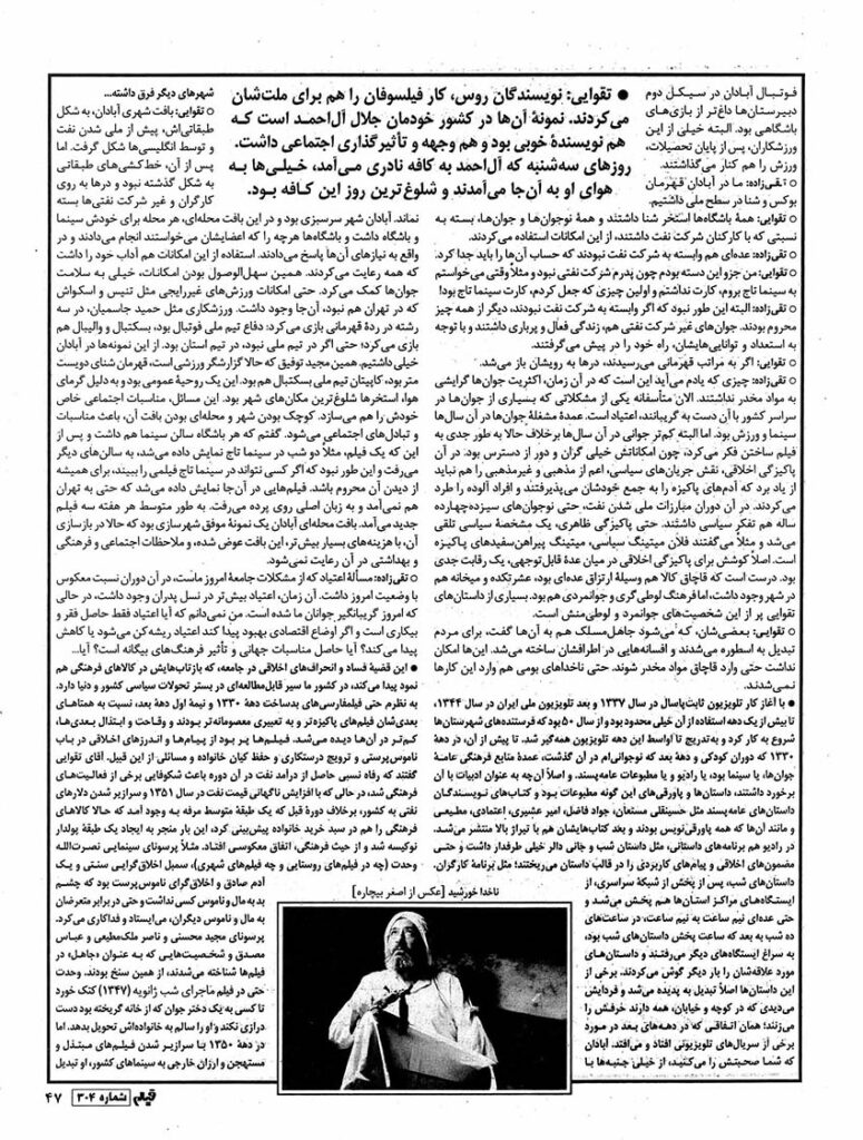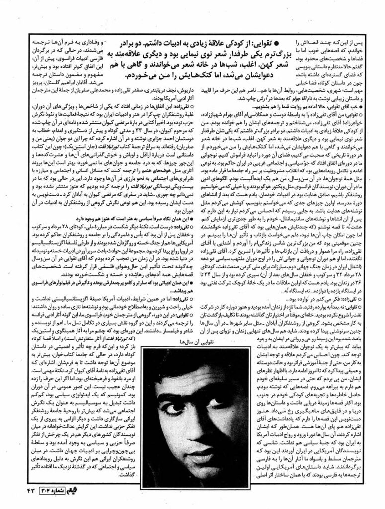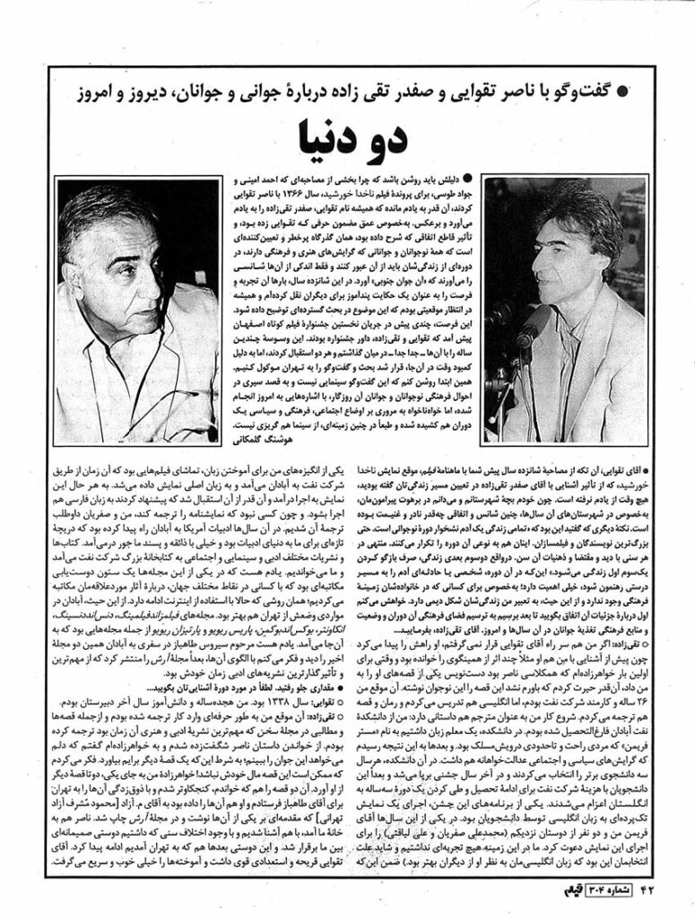 این گفتوگوی مفصل را بیستودو سال پیش انجام دادم که در شماره 304 ماهنامه «فیلم» (شهریور 1382) چاپ شد. علت انتخاب چنین ترکیبی برای گفتوگو این بود که ناصر تقوایی در مصاحبهای دیگر در مجله از تأثیری که آقای تقیزاده در نوجوانی بر او گذاشته گفته بود؛ زمانی که تقیزاده به دلیل کار در شرکت نفت در آبادان زندگی میکرد و تقوایی توضیح داده بود که تأثیر او فقط بابت ترجمهها و نوشتههایش نبوده است. فکر کردم گفتوگویی دو نفره با آنها درباره دو دوران و دو دنیا میتواند حاوی نکتههای بسیاری باشد که بود. حالا پس از گذشت بیش از دو دهه دیگر که در زندگی تقوایی به سکوت گذشت و تقیزاده هم چهار سال پیش درگذشت، میتواند این گفتوگو را پرمعناتر کند.