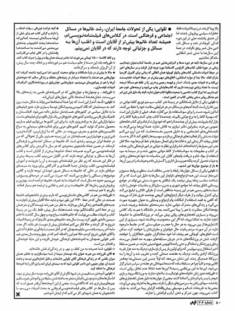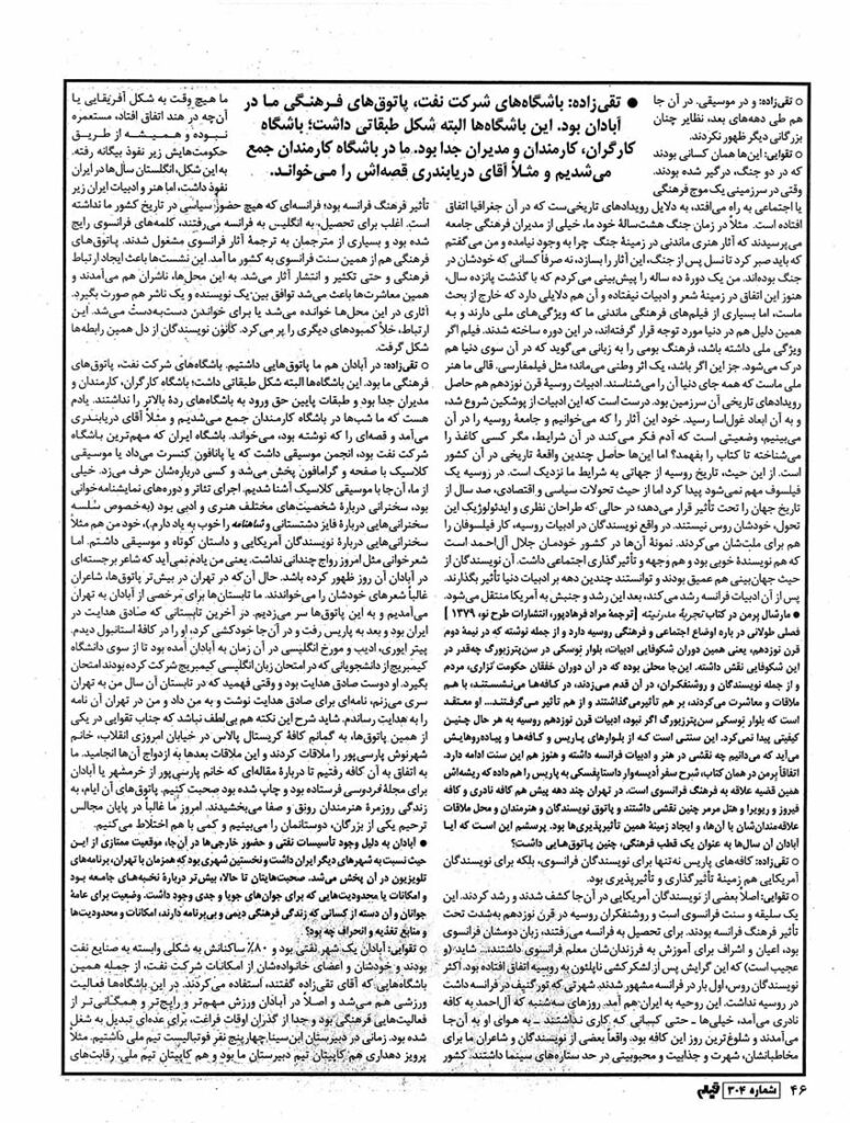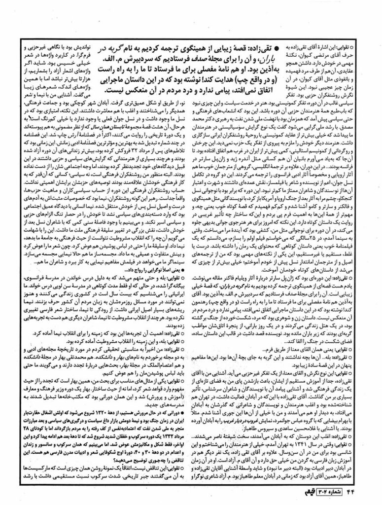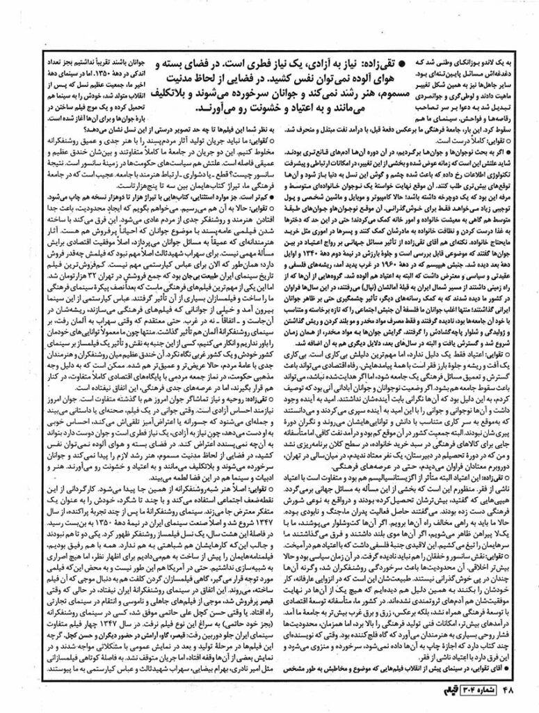 این گفتوگوی مفصل را بیستودو سال پیش انجام دادم که در شماره 304 ماهنامه «فیلم» (شهریور 1382) چاپ شد. علت انتخاب چنین ترکیبی برای گفتوگو این بود که ناصر تقوایی در مصاحبهای دیگر در مجله از تأثیری که آقای تقیزاده در نوجوانی بر او گذاشته گفته بود؛ زمانی که تقیزاده به دلیل کار در شرکت نفت در آبادان زندگی میکرد و تقوایی توضیح داده بود که تأثیر او فقط بابت ترجمهها و نوشتههایش نبوده است. فکر کردم گفتوگویی دو نفره با آنها درباره دو دوران و دو دنیا میتواند حاوی نکتههای بسیاری باشد که بود. حالا پس از گذشت بیش از دو دهه دیگر که در زندگی تقوایی به سکوت گذشت و تقیزاده هم چهار سال پیش درگذشت، میتواند این گفتوگو را پرمعناتر کند.